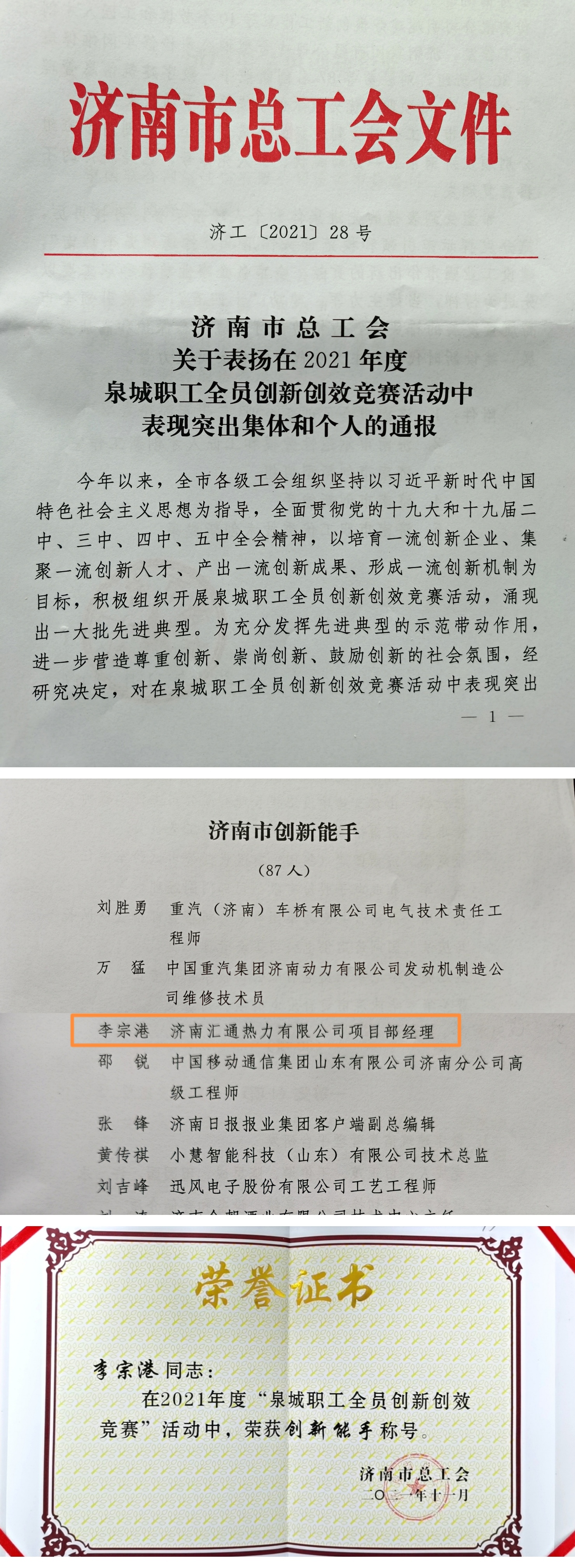 濟(jì)南能源集團(tuán)所屬工程集團(tuán)匯通熱力李宗港在2021年度泉城職工全員創(chuàng)新創(chuàng)效競(jìng)賽活動(dòng)中榮獲“濟(jì)南市創(chuàng)新能手”稱號(hào)