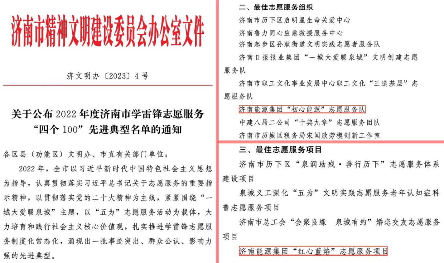 為深入推進(jìn)“五為”文明實(shí)踐志愿服務(wù),充分發(fā)揮先進(jìn)典型示范帶動(dòng)作用,近日,濟(jì)南市文明委表彰全市學(xué)雷鋒志愿服務(wù)“四個(gè)100”先進(jìn)典型。濟(jì)南能源集團(tuán)“初心能源”志愿服務(wù)隊(duì)獲評(píng)“最佳志愿服務(wù)組織”,“紅心藍(lán)焰”志愿服務(wù)項(xiàng)目獲評(píng)“最佳志愿服務(wù)項(xiàng)目”。