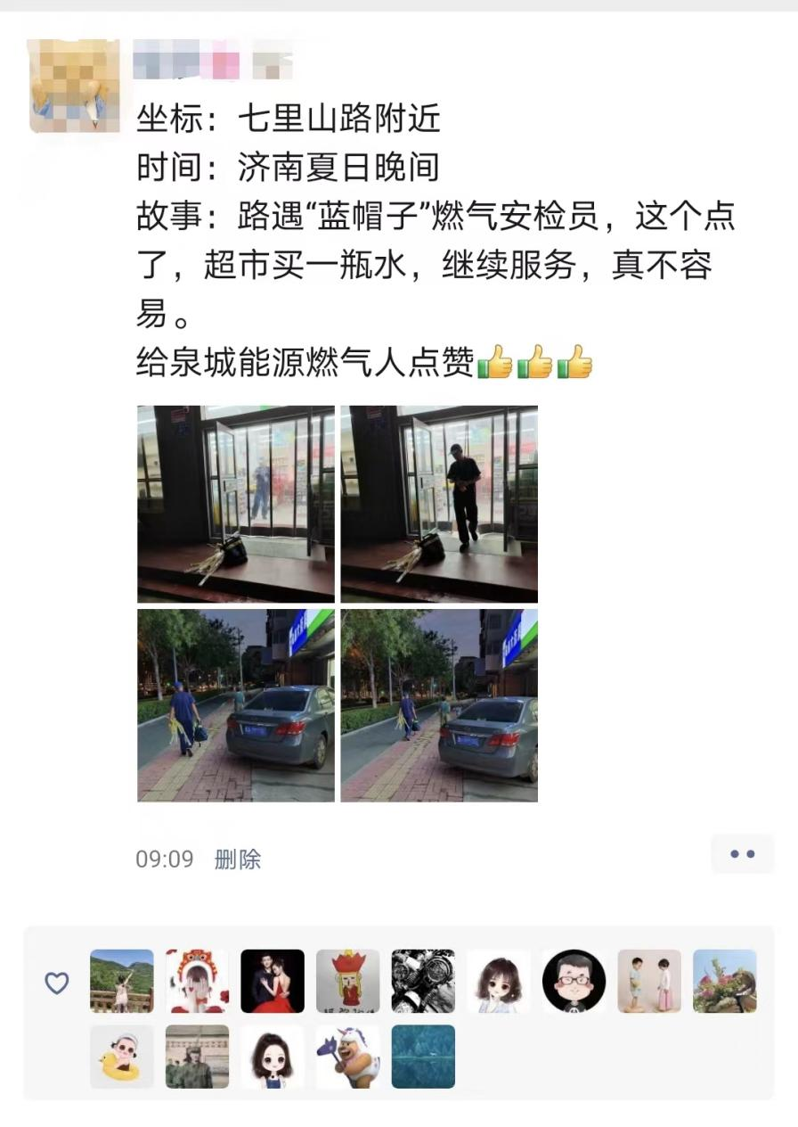 7月29日,濟(jì)南能源集團(tuán)所屬兩家燃?xì)馄髽I(yè)的同事們刷到了這樣一條朋友圈:“坐標(biāo):七里山路附近,時(shí)間:濟(jì)南夏日晚間,故事:路遇‘藍(lán)帽子’燃?xì)獍矙z員,這個(gè)點(diǎn)了,超市買一瓶水,繼續(xù)服務(wù),真不容易。給泉城能源燃?xì)馊它c(diǎn)贊!”簡(jiǎn)潔明了的一串字,配上4張“藍(lán)帽子”夜間辛勞的身影——手提滿滿一袋子沒(méi)拆封的燃?xì)獠讳P鋼軟管,在超市匆匆買了一瓶水,又急忙奔赴向下一位用戶家中,令人感嘆不已。