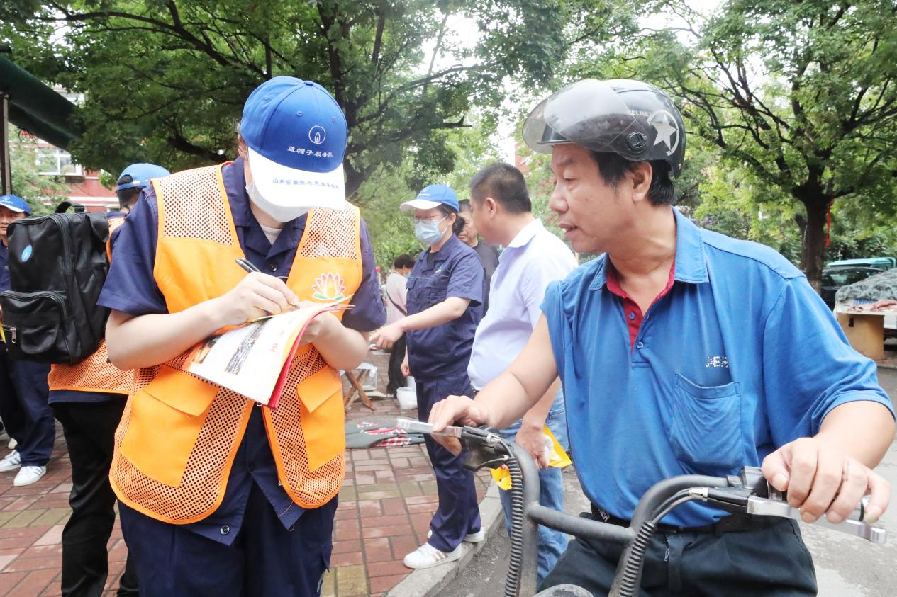 記者在現(xiàn)場(chǎng)可以看到,烈日下“紅心藍(lán)焰”黨員先鋒服務(wù)隊(duì)工作人員們站在社區(qū)道路上,一次次上前叫住居民用戶,宣傳、詢問(wèn),然后引領(lǐng)至宣傳咨詢臺(tái)登記,再安排供氣、供熱管家跟隨用戶去用戶家中安檢、更換軟管……一位一位地落實(shí)登記,一遍又一遍地向用戶進(jìn)行安全用氣宣傳。不一會(huì)兒,豆大的汗珠一顆一顆順著他們的帽檐流下,背后的藍(lán)色工裝也早已汗?jié)窳艘黄?/p>