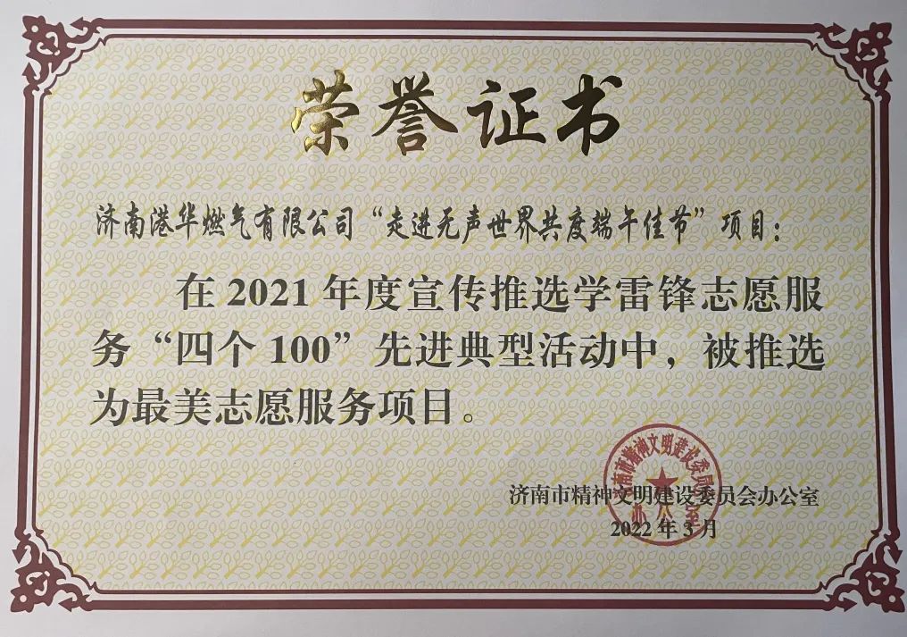 熱烈祝賀濟南能源集團所屬山東濟華燃氣“安所在,愛相隨”志愿服務項目和濟南港華燃氣“走進無聲世界 共度端午佳節(jié)”項目在“2021 年度全市學雷鋒志愿服務 ‘四個 100’先進典型活動中榮獲最美志愿服務項目。