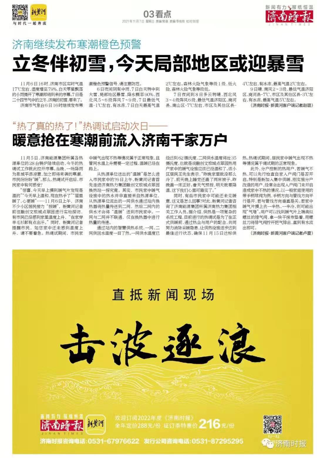 【濟(jì)南時(shí)報(bào)】“熱了真的熱了!”熱調(diào)試啟動次日,暖意搶在寒潮前流入濟(jì)南千家萬戶