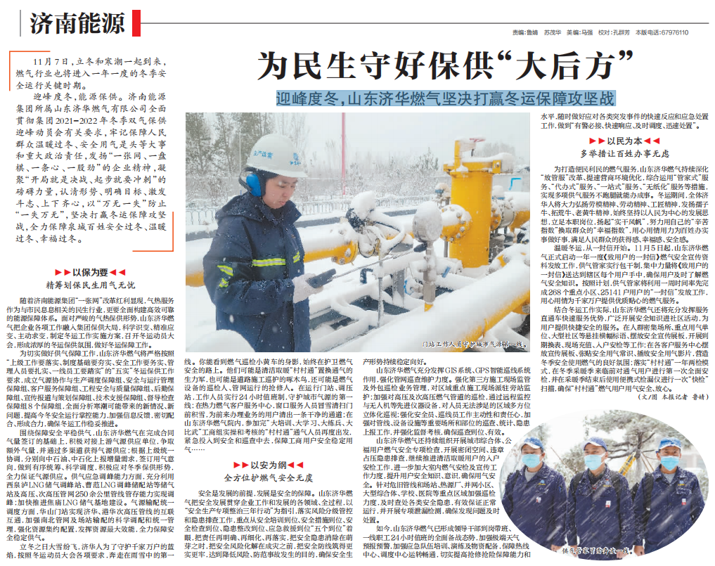 【濟南日報】為民生守好保供“大后方” 迎峰度冬,山東濟華燃氣堅決打贏冬運保障攻堅戰(zhàn)